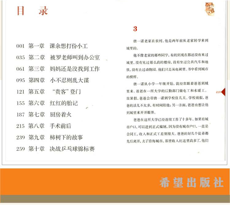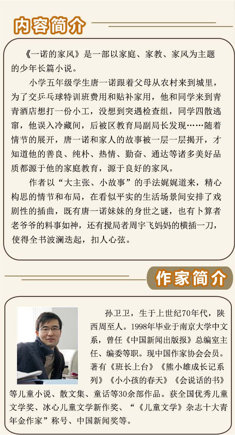 小学五年级学生唐一诺跟着父母从农村来到城里,为了交乒乓球特训班的费用及贴补家用,他和同学来到青青酒店想打一份小工,没想到突遇检查组,同学们四散逃窜,而他误入冷藏间,后被区教育局副局长发现……随着情节的发展,唐一诺和家人的故事被一层一层揭开,他的善良、纯朴、热情、勤奋、通达也在其中呈现。读者同时也看到了,唐一诺诸多的美好品质都源于他的家庭教育,源于良好的家风。
